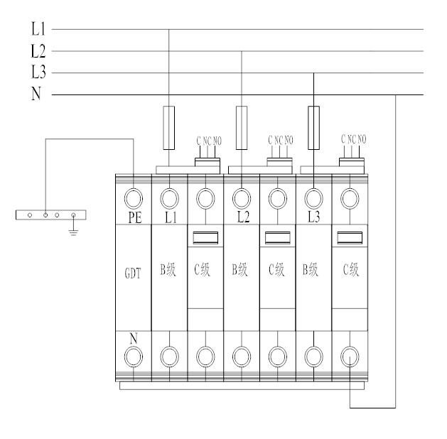 5.3 電源相線(L)、零線(N)分別接入電涌保護器相應(yīng)接線端子,保證牢固及可靠,將電涌保護器接地端與地線作良好電氣連接。