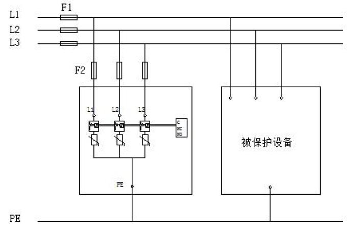 交流浪涌保護(hù)器用于交流電源的第二級(jí)(C 級(jí))雷電過(guò)電壓保護(hù),三相浪涌保護(hù)器采用-3防護(hù)電路,如下圖所示。