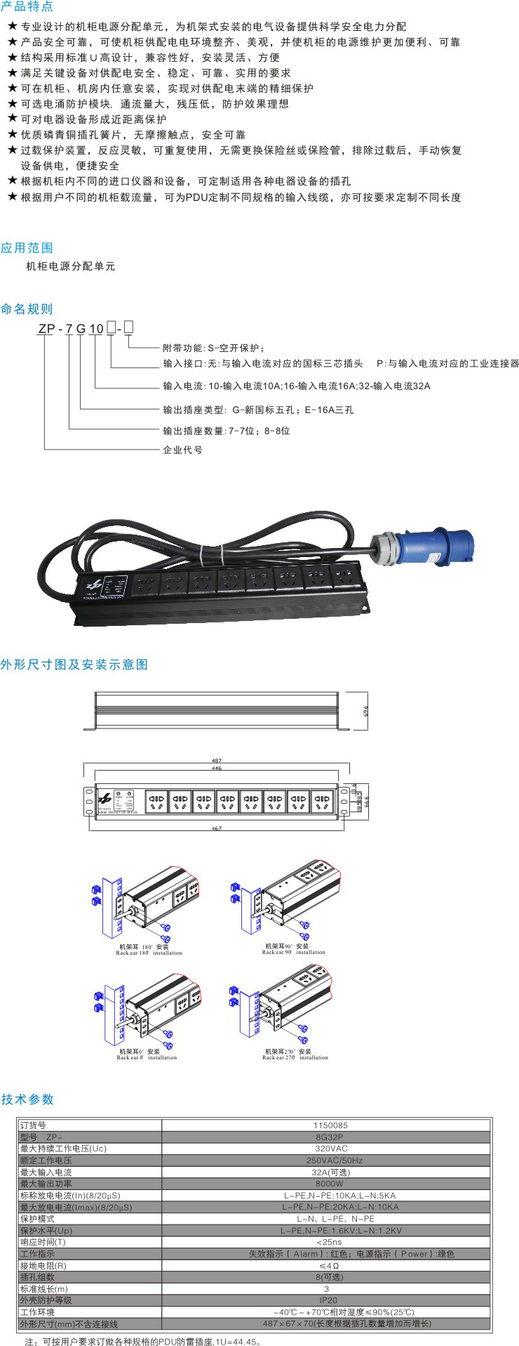 PDU防雷插座(機(jī)架配電單元)ZP-8G32P