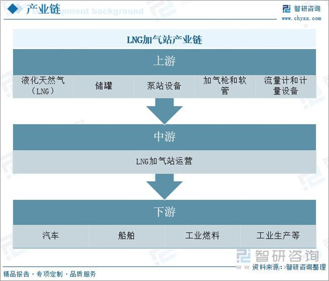 二、LNG加氣站行業(yè)產(chǎn)業(yè)鏈 在產(chǎn)業(yè)鏈方面,中國LNG加氣站行業(yè)已經(jīng)形成完整的產(chǎn)業(yè)鏈,涵蓋了從上游的原料及零部件供應到中游的運營,再到下游的應用領域。從上游來看,主要包括液化天然氣(LNG)、儲罐、泵站設備、加氣槍和軟管、流量計和計量設備等。其中液化天然氣(LNG)主要來源于國內(nèi)天然氣田的開采、進口LNG等,其供應穩(wěn)定直接影響到下游加氣站的運營。中游主要是指LNG加氣站的運營。下游主要是指LNG的應用領域,包括汽車、船舶、工業(yè)燃料、工業(yè)生產(chǎn)等。隨著這些領域的持續(xù)發(fā)展,對LNG需求也會持續(xù)增加,進而帶動LNG加氣站行業(yè)的發(fā)展。