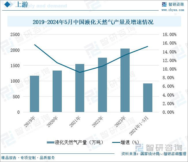 一直以來,我國資源稟賦是“富煤缺油少氣”。天然氣在我國能源中的比重很小,從我國的天然氣發(fā)展形勢來看,天然氣資源有限,天然氣產(chǎn)量遠遠小于需求,供需缺口越來越大。LNG作為一種高效的生態(tài)型優(yōu)質(zhì)能源和燃料、向可再生能源轉(zhuǎn)型的主要過渡燃料,使用比較廣泛。一方面,因環(huán)保的要求,近幾年各地“煤改氣”“油改氣”規(guī)模很大,LNG需求迅速增加;另一方面,因風電、光伏等可再生能源存在間歇性、波動性特點,LNG成為配套能源以備不時之需。可見,LNG行業(yè)需求量巨大,為滿足這一市場需求,越來越多的企業(yè)開始進入該領域,行業(yè)供給不斷增加。數(shù)據(jù)顯示,2019年中國液化天然氣產(chǎn)量達到1165萬噸,同比上漲15.60%;2023年逐步增長至2037.1萬噸,同比上漲13.20%。2024年1-5月,中國液化天然氣產(chǎn)量達到920.6萬噸,同比上漲15.20%。
